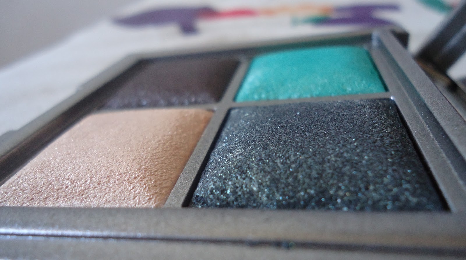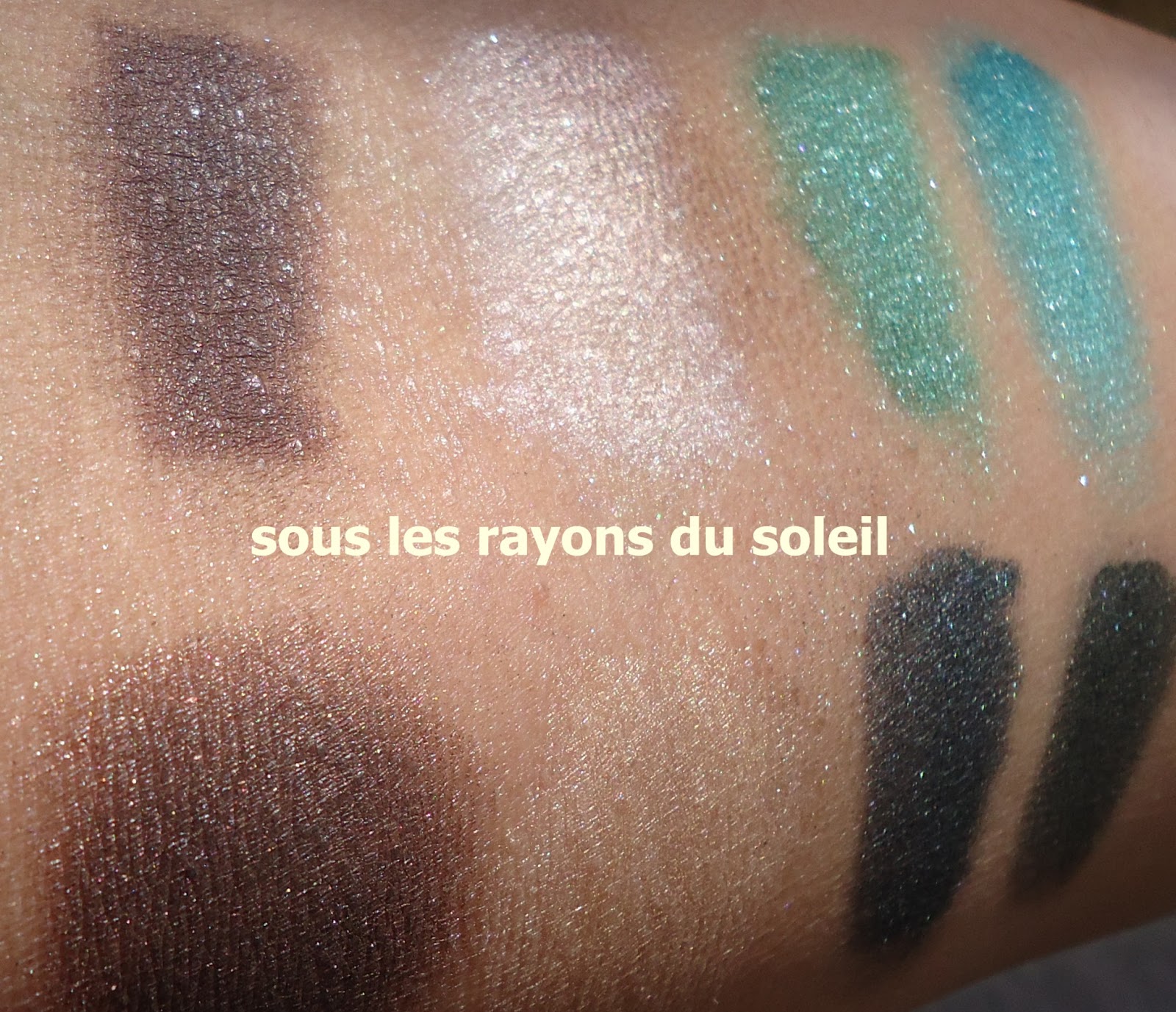 La première couleur en haut à gauche est un vert lagon super flashy, ultra pailleté d'une texture crémeuse. La seconde est un magnifique vert sapin, parsemé de paillettes. Ensuite on a un très joli brun taupe, avec des paillettes argentées et pour finir un beige légèrement doré pailleté également, excellent pour la touche lumière au coin interne des yeux ,sous les sourcils voire sur les pommettes et l'ensemble du visage pour un fini glamour & glowy.